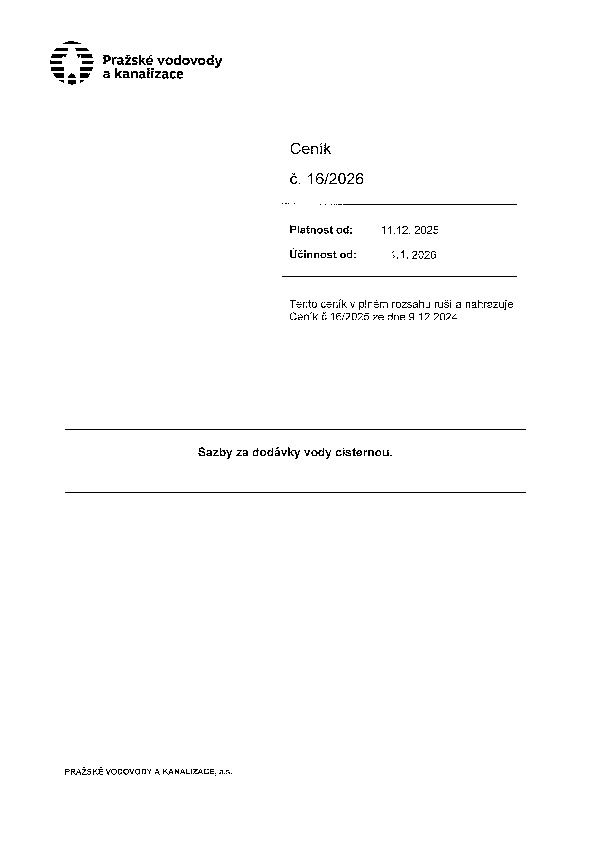 Ceník 16 Sazby za dodávky vody cisternou, dodávka vody cisternou, kolik za dodávku vody cisternou, kolik stojí dodávka vody cisternou