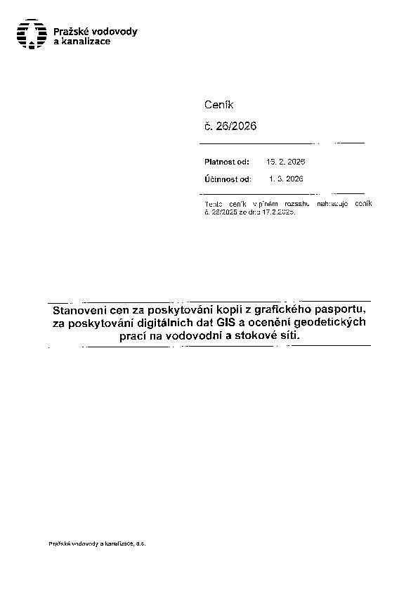 Ceník 26 Stanovení cen za poskytování kopií z grafického pasportu, za poskytování digitálních dat GIS a ocenění geodetických prací na vodovodní a stokové síti, kopie z grafického pasportu, digitální data GIS, geodetické práce, grafický pasport