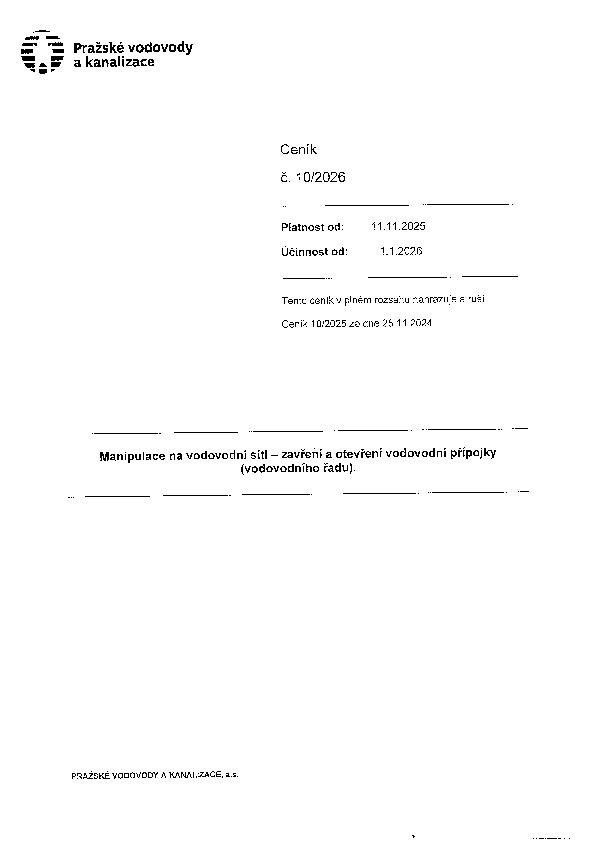 Ceník č. 10 Manipulace na vodovodní síti - zavření a otevření vodovodní přípojky (vodovodního řadu)