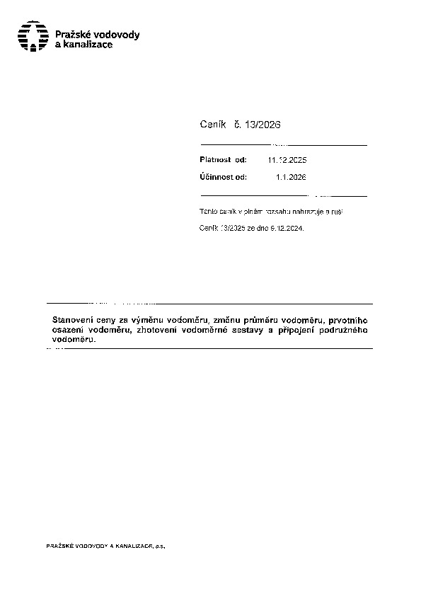 Ceník č. 13 Stanovení ceny za výměnu vodoměru, změnu průměru vodoměru, prvotního osazení vodoměru, zhotovení vodoměrné sestavy a připojení podružného vodoměru