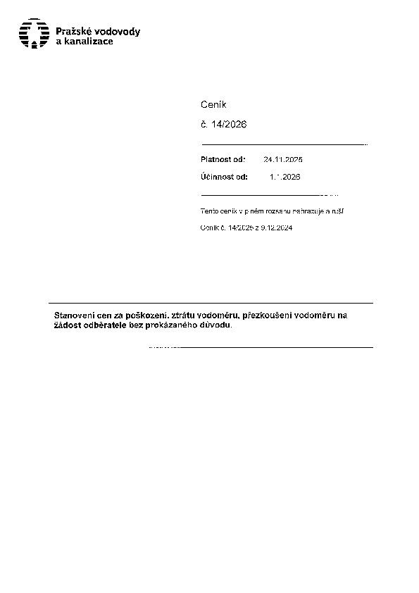 Ceník č. 14 Stanovení cen za poškození, ztrátu vodoměru, přezkoušení vodoměru na žádost odběratele bez prokázaného důvodu